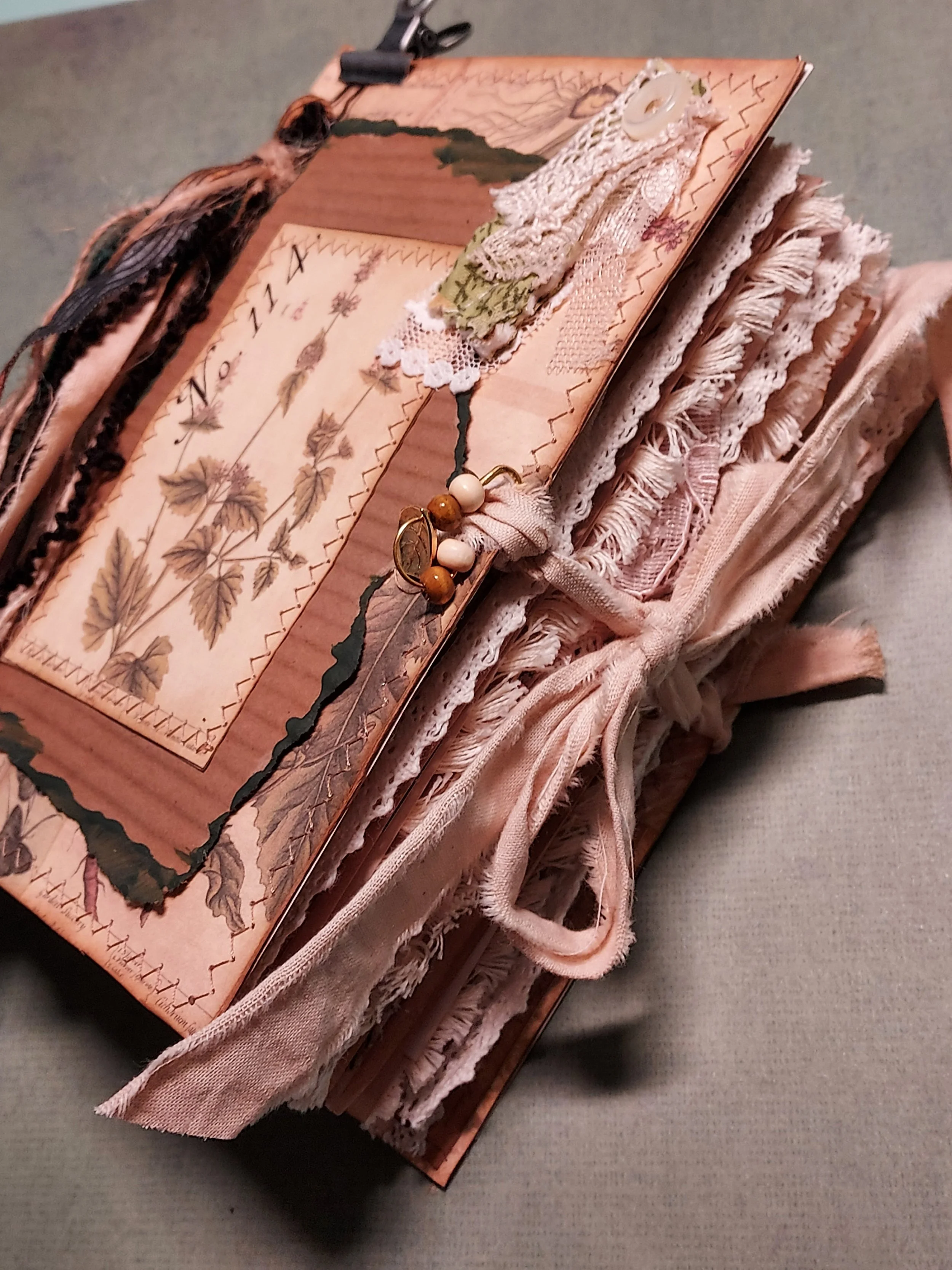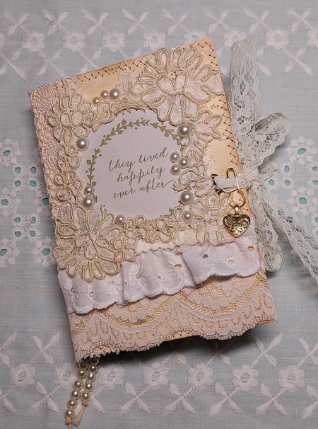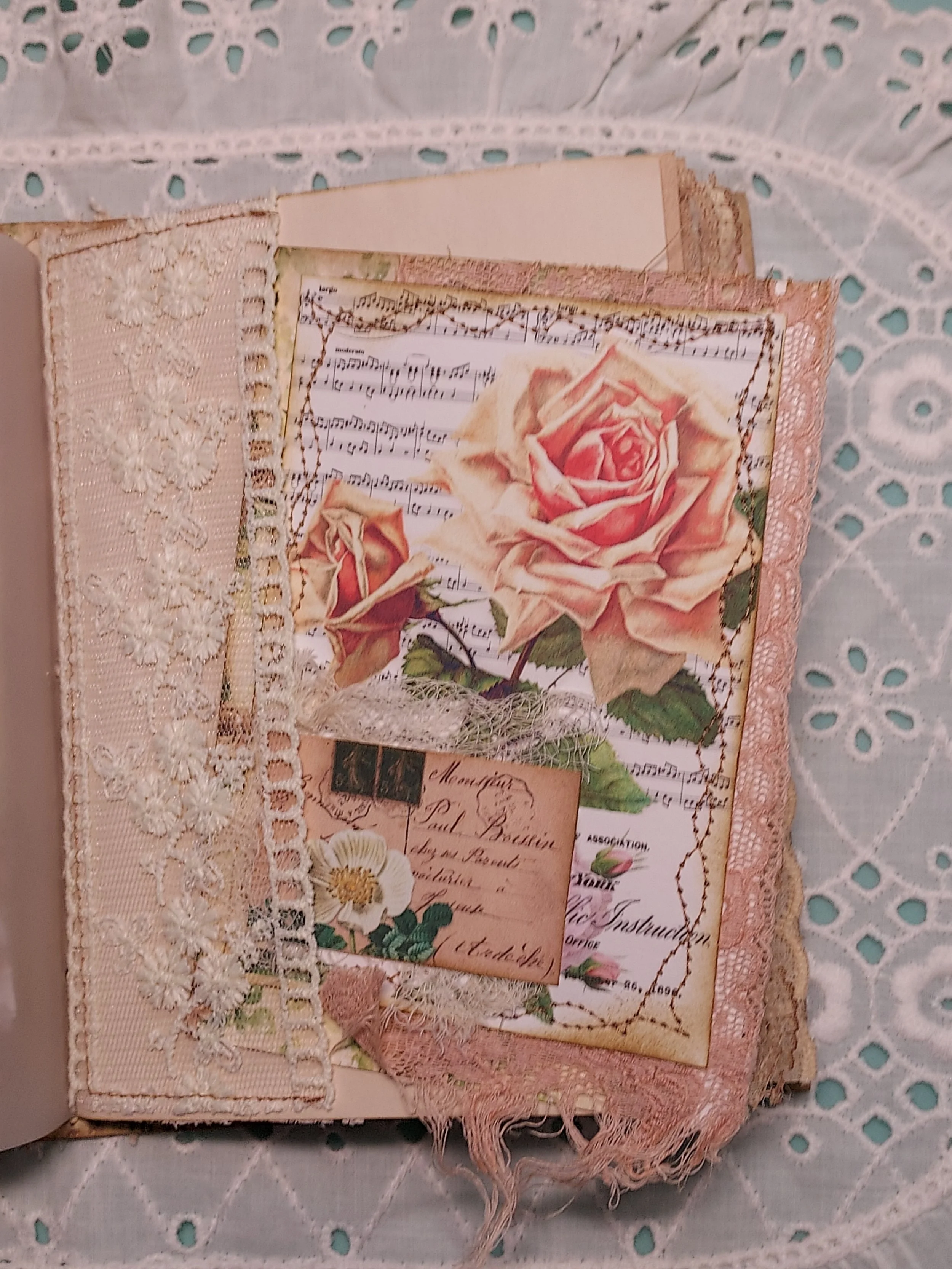 The journal contains decorative ephemera such as lace embellished notecards, mini journals, fabric and lace pockets and ruffles, lace edged pages and vintage images.